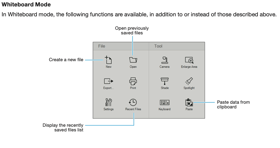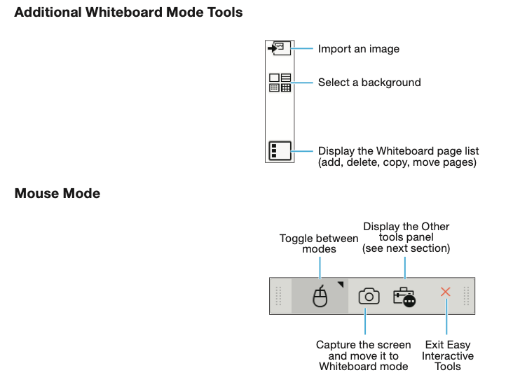 and capture, save, or print your pages. In Mouse mode, you can interact with your desktop to do things like open applications, access links, and operate scroll bars. You can perform the following functions on the toolbar. (If you are using a document camera, a toolbar is available on the Camera screen as well.)