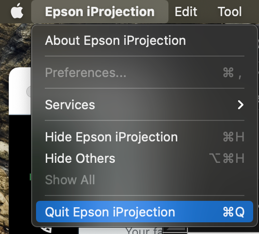 - If connecting with Epson iProject on your computer, fully quit the application with its full menu, located by the Apple menu or Force Quit by using the Apple menu.